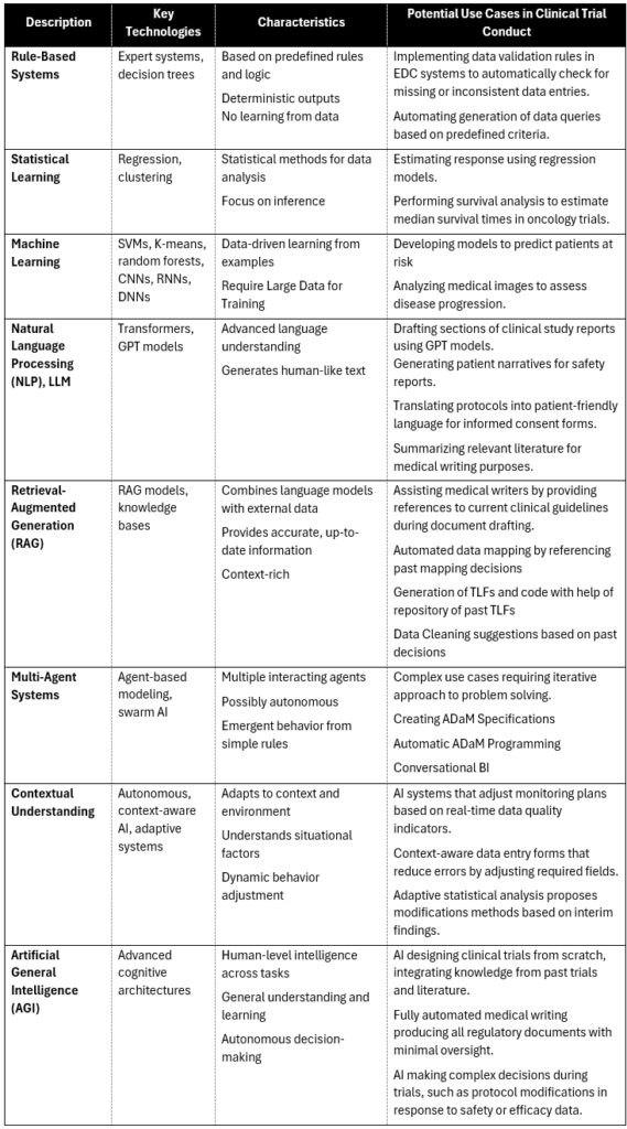 As we adopt RAG & multi-agent systems, we are capable of working on complex use cases in statistical programming, data management, and medical writing. The newer technologies enhance our capabilities, allowing us to handle tasks more efficiently and independently. The table below reflects this journey, highlighting how each stage of AI development has expanded our abilities and is paving the way for even greater advancements.